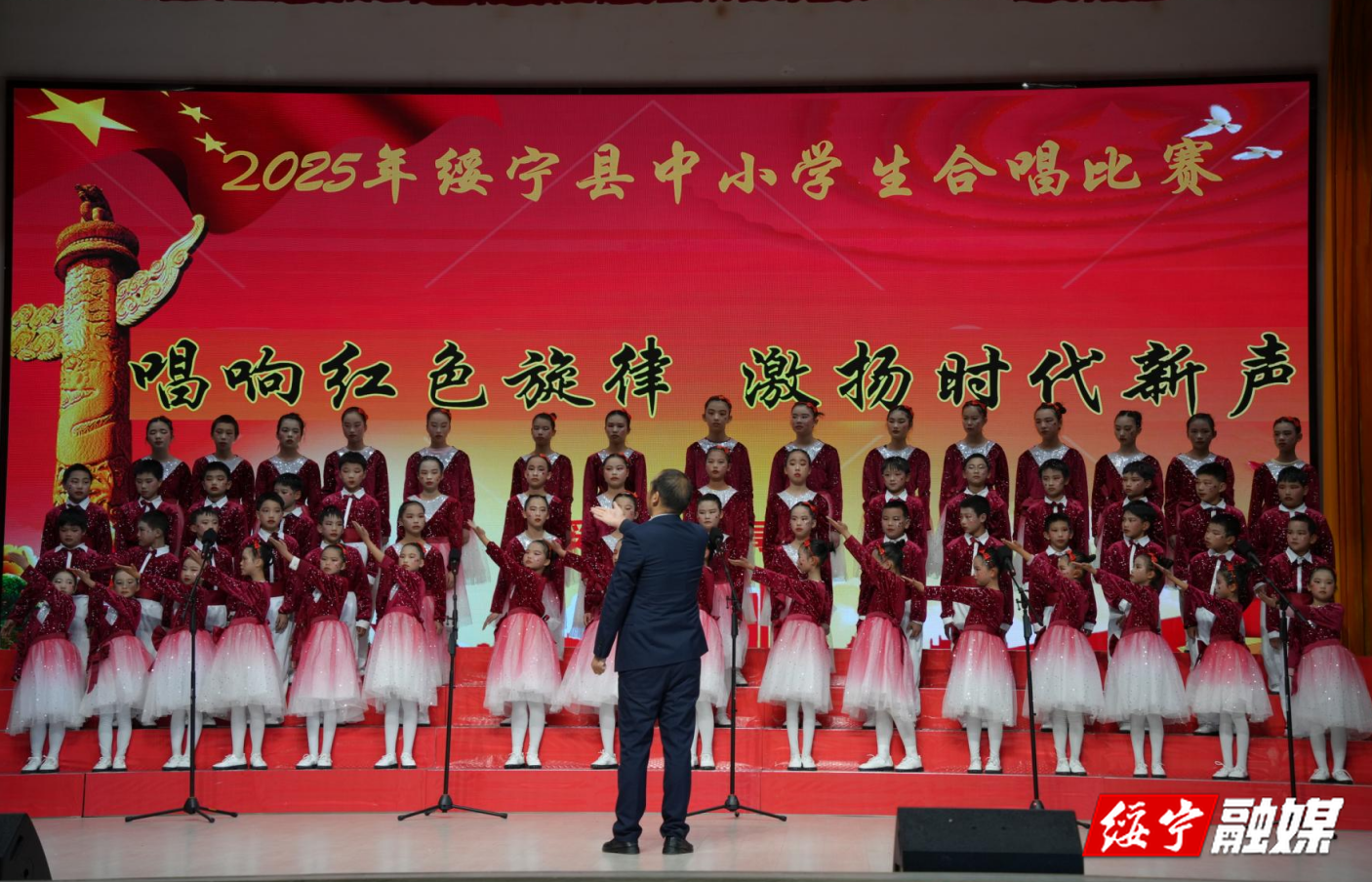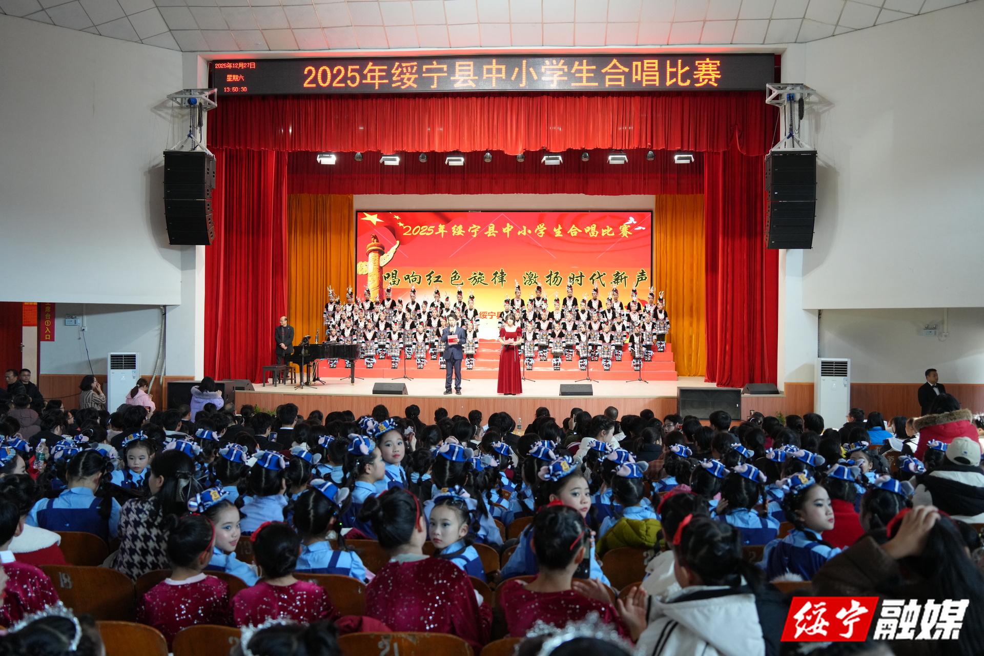 绥宁新闻网讯(记者 向海 宋三龙 实习生 黄钟 通讯员 杨树国 张先邵 彭 超)12月27日,绥宁一中大礼堂内红旗飘扬、歌声嘹亮,以“唱响红色旋律,激扬时代新声”为主题的2025年绥宁县中小学生合唱比赛隆重举行。全县各中小学参赛代表队齐聚赛场,用歌声抒发拳拳爱国情怀,展现朝气蓬勃的青春风采,集中展示我县中小学艺术教育丰硕成果,引导青少年厚植家国情怀,涵养“向真、向善、向美”的优良品格。
