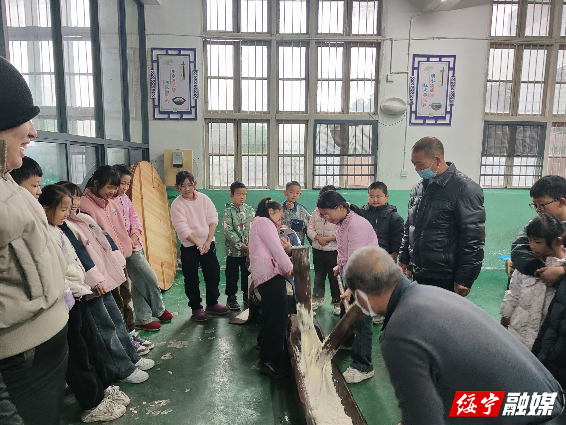 食堂内划分的打糍粑区与包饺子区热闹非凡,学生们在老师和家长的指导下分组参与。打糍粑区里,身着民族服饰的同学们轮流挥起糍粑锤,将蒸熟的糯米捶打成黏稠成团的糍粑,随后捏成各式形状,蘸上红糖、黄豆粉品尝,香甜气息弥漫全场。包饺子区,同学们发挥创意,包出月牙形、元宝形等各具特色的饺子。欢声笑语中,一张张饺子皮变成了饱含心意的美食。活动现场还设置了民族知识问答环节,让同学们在玩乐中增强了对民族文化的了解与认同。活动最后,师生齐聚食堂,共同品尝自己动手制作的美食,分享快乐与收获。
